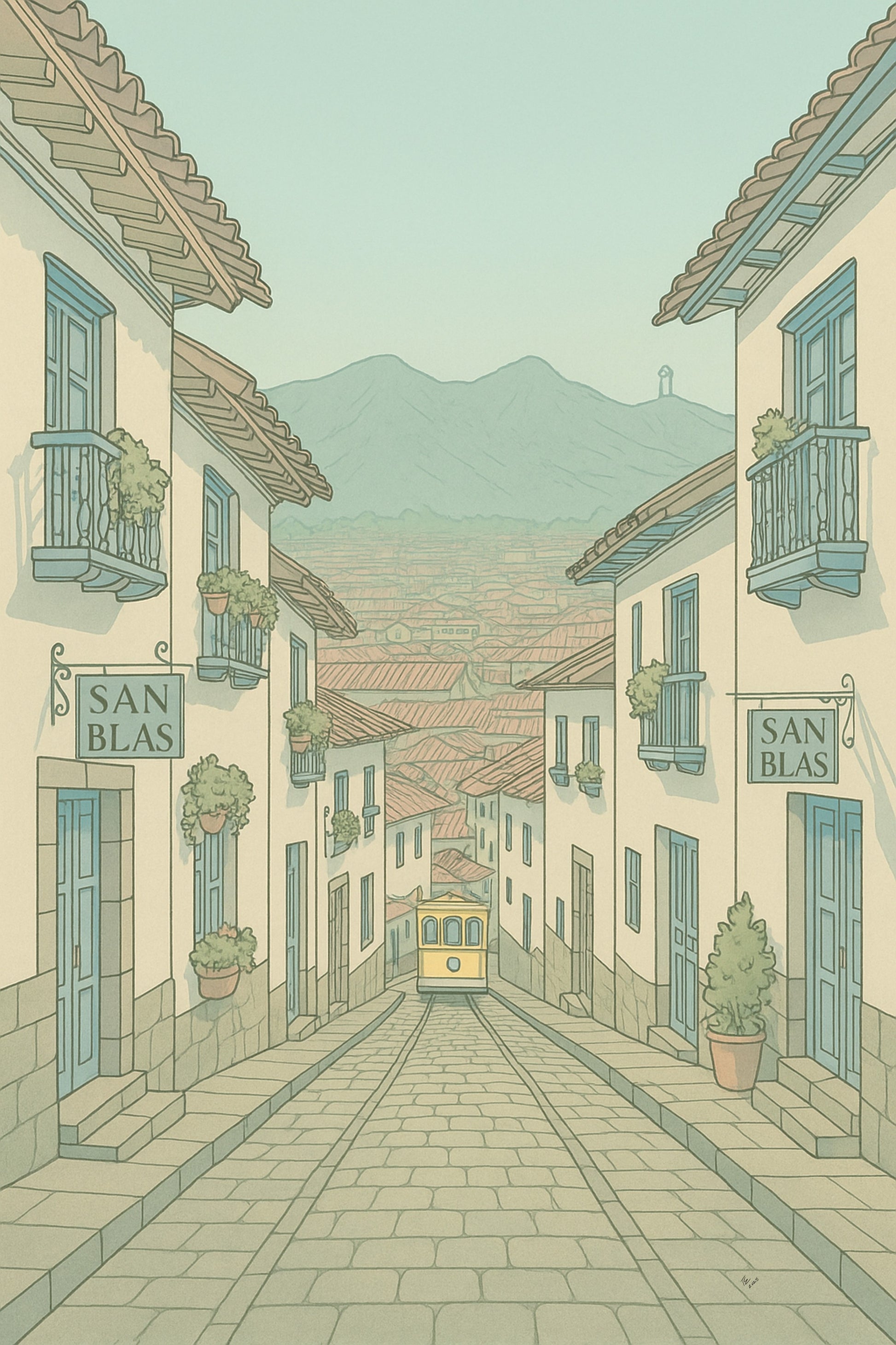 Bring the beauty of San Blas, Cusco, Peru into your home with this pastel fine-line illustration from the Iconic Neighborhoods Around the World collection. Known for its steep cobblestone streets, whitewashed walls, and vivid blue balconies, San Blas reflects the elegance and resilience of Spanish Colonial architecture set against the stunning backdrop of the Andes.