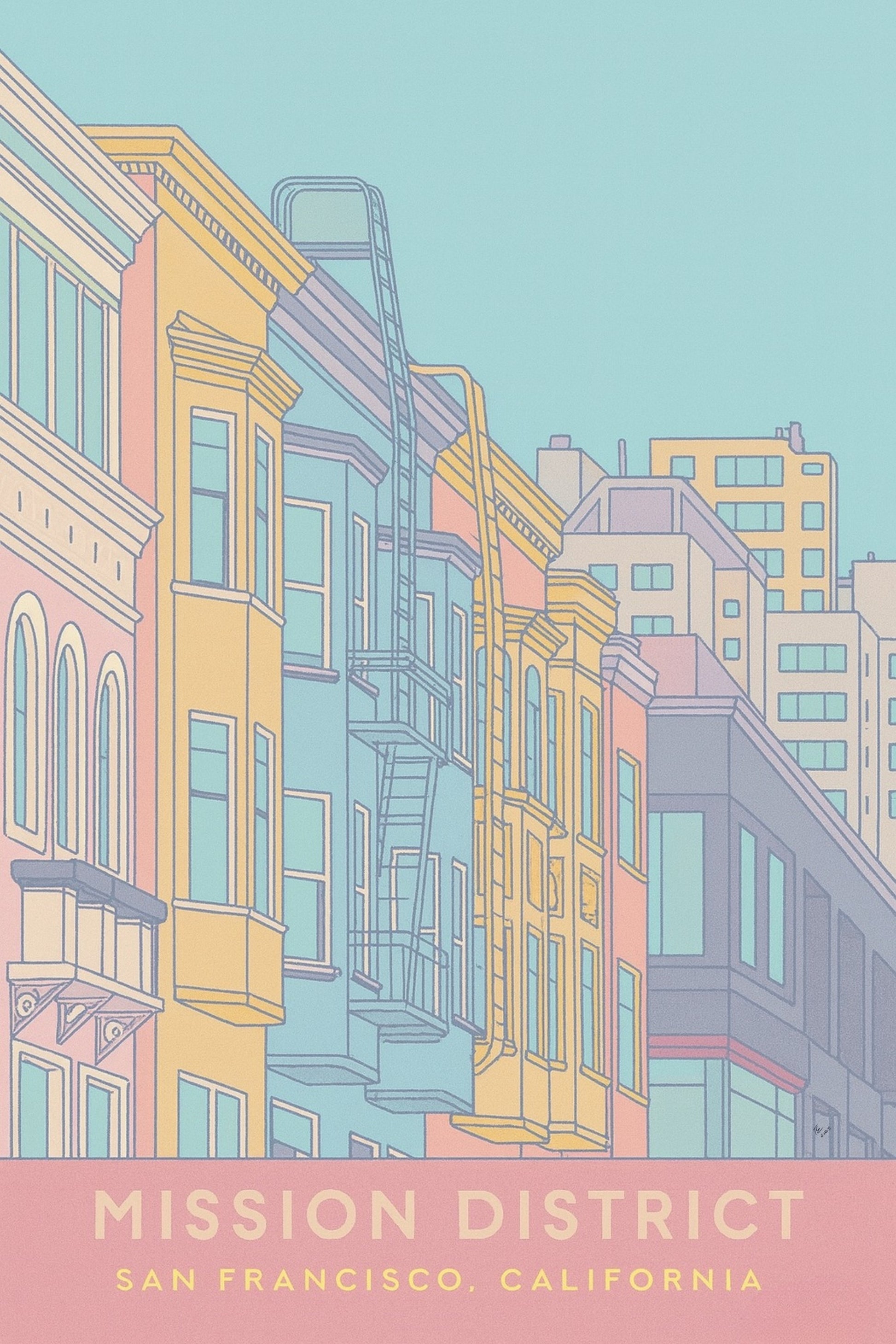 Murals, sunlight, and bohemian rhythm; the Mission District captures the creative heartbeat of San Francisco, painted in bold colors and cultural layers.